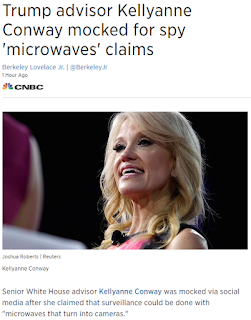 I'm no surveillance expert, so for all I know there is somewhere in some secret-location subterranean server room a vast database of microwave-taken photos of every person in America folding napkins and doing dishes. Except me. Because I hate doing dishes. But again, given Miss Kellyanne's abovementioned in-perpetuity sewer status, this Bowling Green Microwave Incident defines a level of intellectual firepower and imploding integrity that is actually lower than rock-bottom. Fathoms lower. And it's filled with accidentally burned popcorn. And rubbery scrambled eggs. And reheated cinnamon rolls that turn into chewy rocks if you don't eat them in 3.75 seconds. And, though I'm admittedly sometimes immature on this topic, I do try not to make gratuitous insults based on someone's appearance. But microwaves. Cameras. Kellyanne's face. It's all just too irresistible. Now, please pass the popcorn.